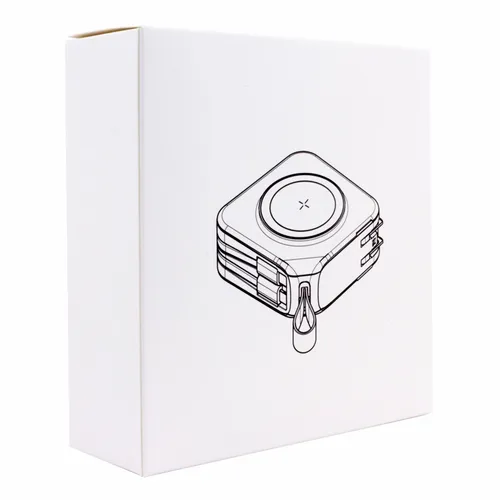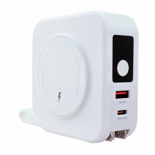 A wireless charging power bank that is perfect for business teams that need to travel extensively. It comes with built-in 8-pin style and Type-C cables as well as a flip-out AC plug. The front ports are QC out and PD in/out with an LED power-level display.