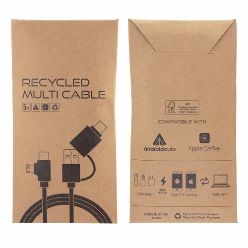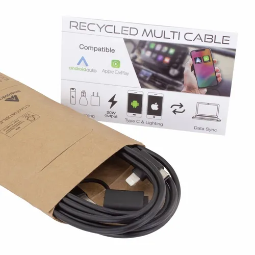The Recycled Multi-Cable works as a charging and data cable. It helps keep dynamic business teams equipped with the right connections for today's devices. Whether at the office, on the road, or in flight this cable is an easy-to-store cable that anyone would appreciate.