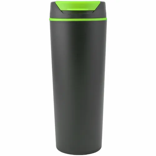 18 oz. / 500 ml Plastic Travel Mug. Double Wall Construction. Color Accent Flip Top. Polypropylene Material