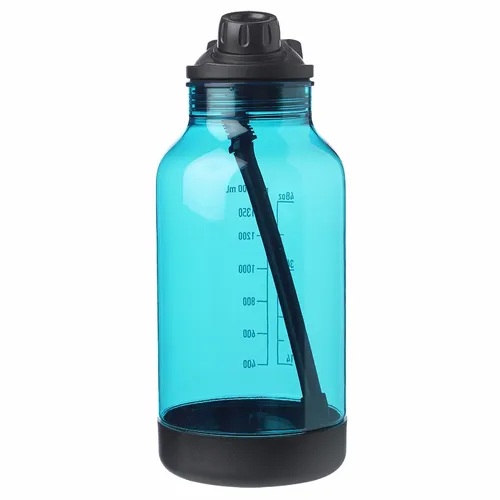 Plastic Water Bottle with Silicone Straw. Plastic Bottom Wrap. Carrying Handle with Flip Open Lid. 64 oz. Capacity Markings