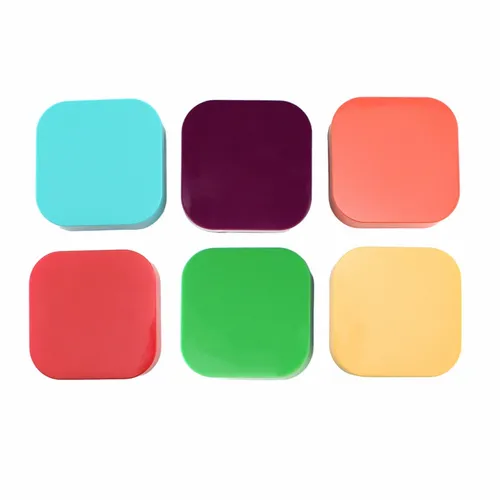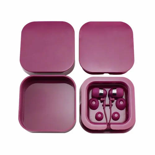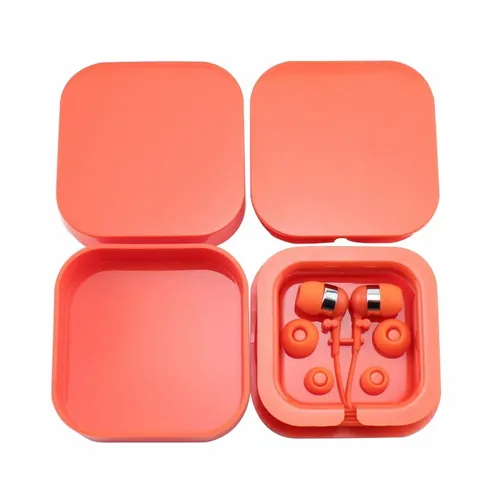Plastic colorful ear buds in a square case with interchangeable ear bud covers. Print your logo on the case for a fun giveaway item!