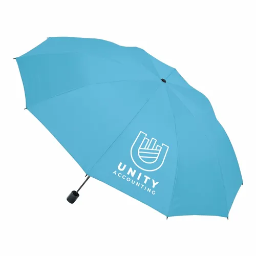 When closed, this umbrella folds down to a compact 15.5" length, making it easy to carry and store. It also includes a wrist strap for added convenience and a matching sleeve for neat storage. Perfect for promoting your brand in style, this umbrella is a practical and eye-catching accessory.