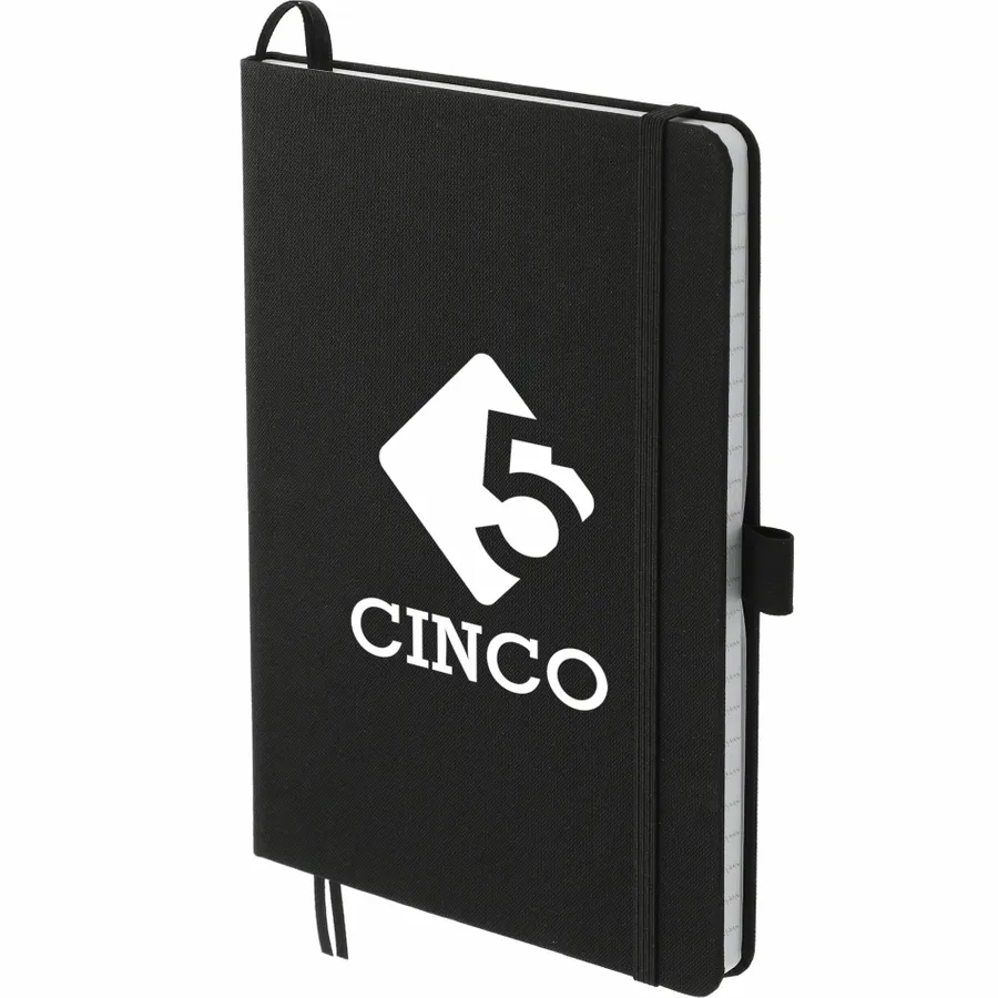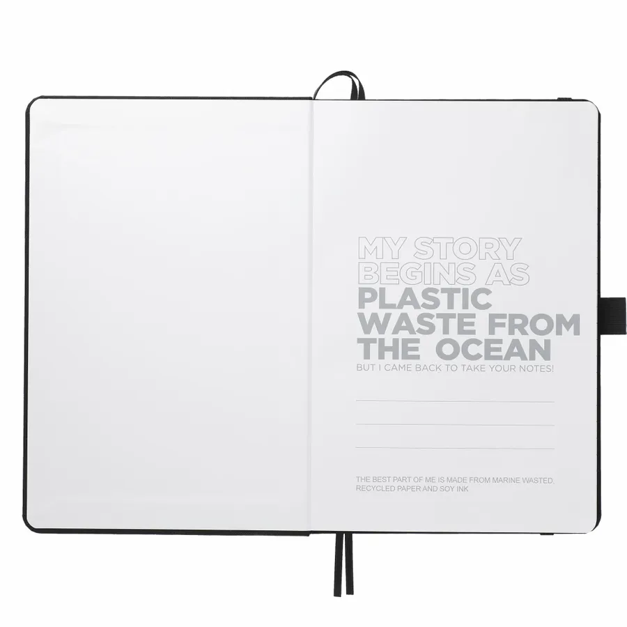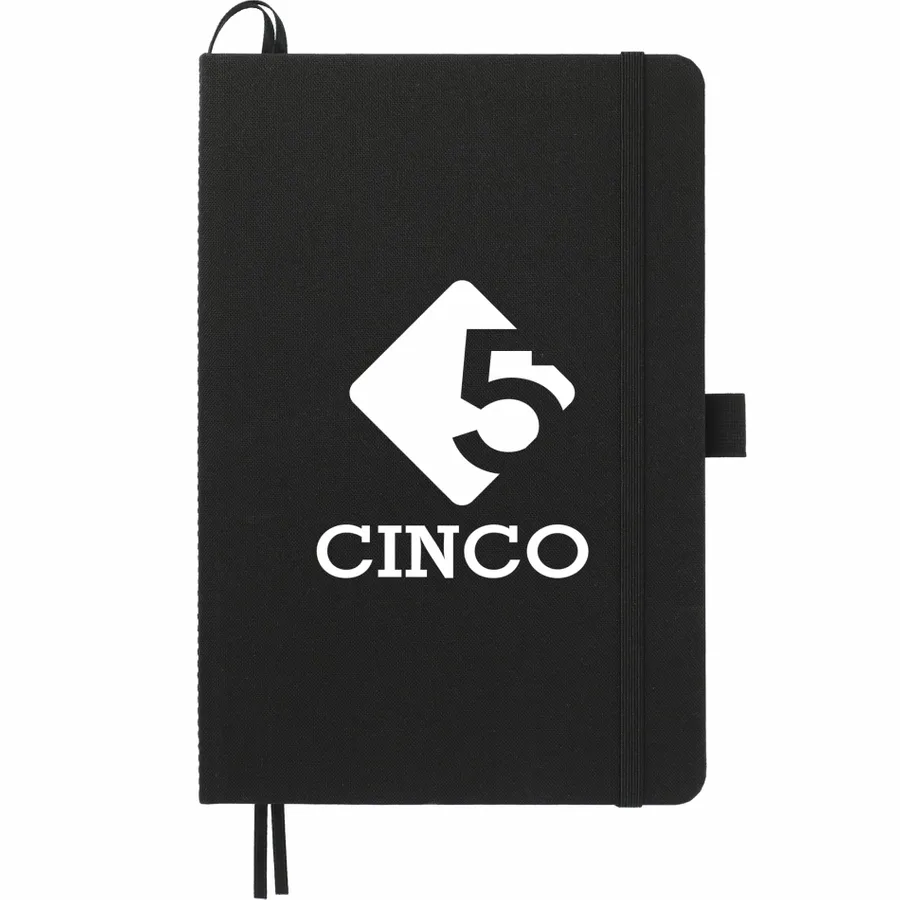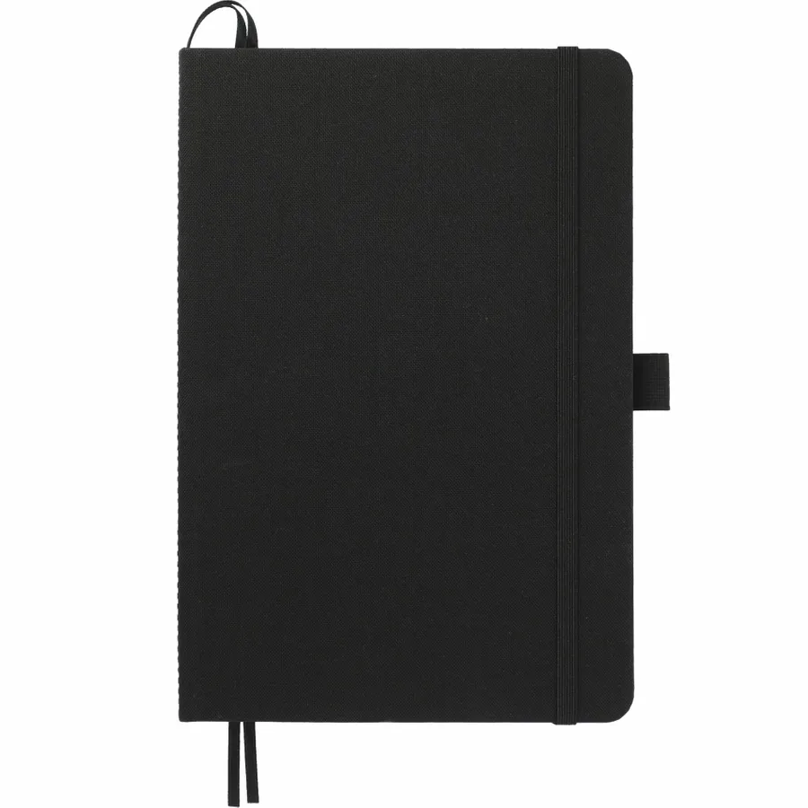 The 5.5 x 8.5 FSC Recycled Marine Bound Journal features a uniquely crafted cover material, Repreve, which is made with recycled ocean plastic and waste collected from coastlines of developing countries. Features color-matching elastic closure, pen loop and ribbon page marker. Includes 96 sheets of white lined FSC recycled paper. Through a partnership with 1% For The Planet, one percent of sales of all EcoSmart products are donated to environmental nonprofits.