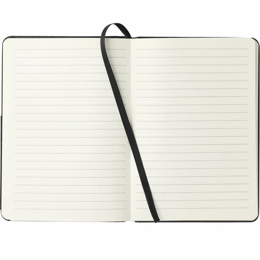 The Bullet 5 x 7 FSC Mix Elastic Phone Pocket Notebook is a bound journal with a hard PU cover. It opens to reveal 80 cream-colored lined sheets of FSC Mix paper with a matching ribbon page marker to hold your place between uses. It also features a front elastic pocket thats perfect for holding smartphones, documents, pens, or other small accessories.