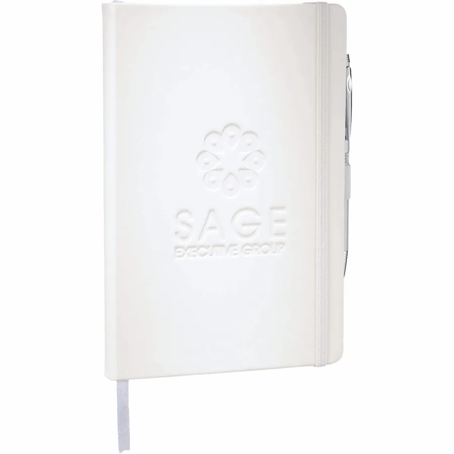 The 5.5 x 8.5 FSC Mix Nova Bound Journal features a faux leather like, hard cover with built-in elastic closure, ribbon page marker, and expandable accordion pocket. Includes 96 sheets of lined white FSC Mix paper. Pen is not included.