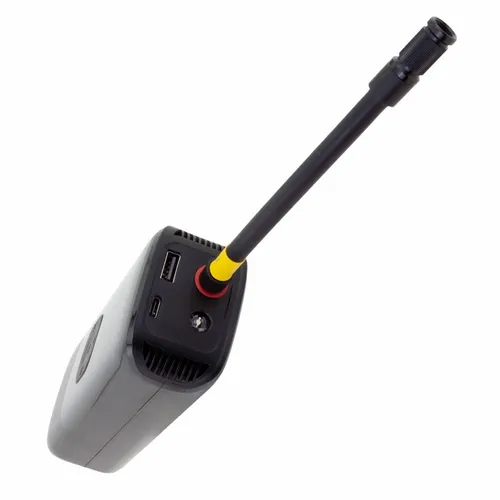 A portable and rechargeable electric tire pump with a large easy to view LED display. It has five inflation modes: automotive, motorcycle, and bicycle tires as well as a setting for sports balls. It also functions as a power bank with a USB output port located on top. Recharge the air pump's built-in lithium battery via its Type-C input port. It is packaged with a compact attachable air hose and a Type-C cable. AC wall adapter not included.
