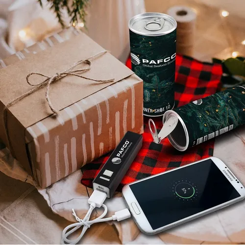 Power up your phone with the PowerShot 10. 2200mAh Powerbank in fully customizable wrap packaging that resembles an energy drink pop can. Phone battery getting low? No worries, simply pop open the PowerShot 10 and connect Powerbank to re-charge your phone!