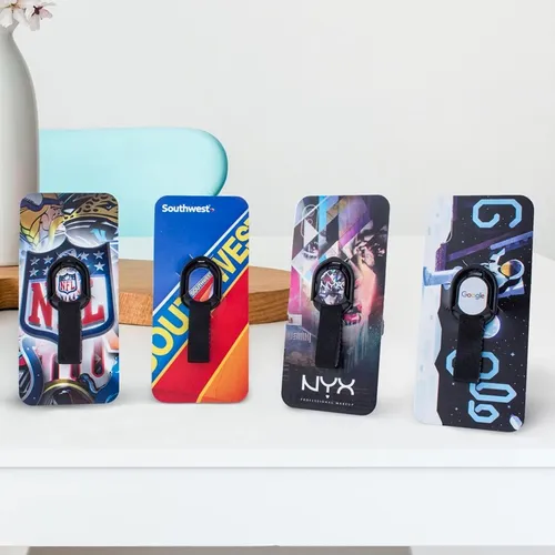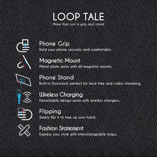 Easily attach a Loop Tale to steady and secure your phone grip. Customize the Loop Tale's back plate with a full-color print to bring alive your brand's story. Swing out the attached metal ring to easily recline your phone vertically on flat surfaces. Excellent for pairing with magnetic car mounts. Metal parts slide apart with ease from the Loop Tale's base for safe wireless charging.