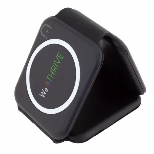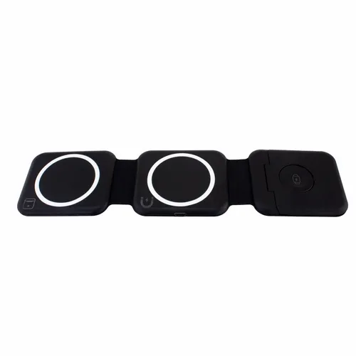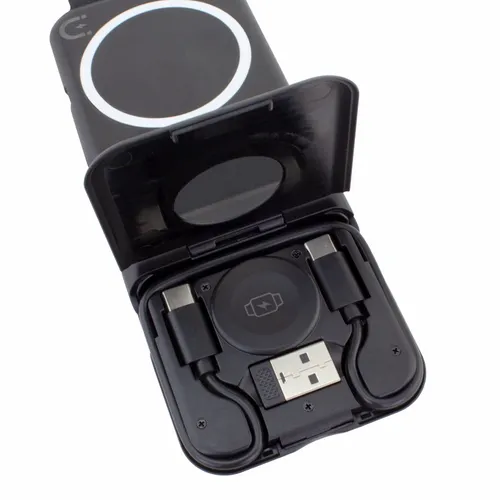 Compact wireless charger for charging up a phone, smart Watch, and ear buds at the same time. Much like our original Stack model, this version features a compartment that conveniently stores a USBC-to-USBC cable.