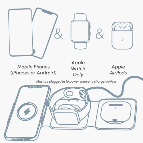 Charging multiple devices at once while traveling just got easier. The Chi-Charge Stack is our brand-new compact device that can wirelessly charge a compatible phone, Apple watch, and AirPods case all at the same time. It is a powerful device that makes a powerful statement. Simply plug into a reliable power source and charge all three. Left Charging Pad: Apple or Android phones/Middle Charging Pad: Apple watch only/Right Charging Pad: Airpods or another phone