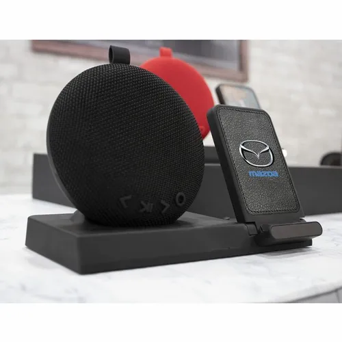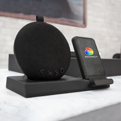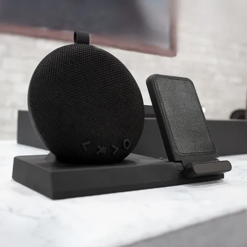 The Chi-Charge Beethoven provides a powerful audio experience from its detachable wireless speaker while charging your device, wirelessly or by USB port. To charge, set your wireless charging enabled device on the Chi-Charge Beethovan device stand to begin charging. And don't worry if your device is not wireless charging enabled! The USB port on the back of the unit allows you to charge your device with its USB charging cable. Packaged in an executive black gift box and branded on the lea